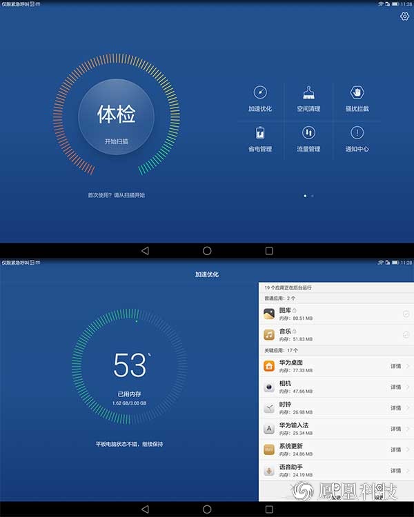 在一进入设置菜单时,我们就可以看到所有的功能选项都是两列分辨率在屏幕两侧,竖直持握时同样是两列,而且在菜单中我们可以看到华为揽阅M2 10.0的虚拟导航键是可以进行隐藏或者自定义设置的,这对于不喜欢虚拟导航键的朋友来说确实是一大福音。而且像是管家应用也变成了“平板管家”,其实在功能上并没有太多差异,不过显示上确实针对大屏幕进行了适配。
