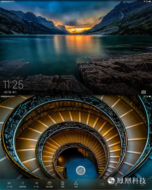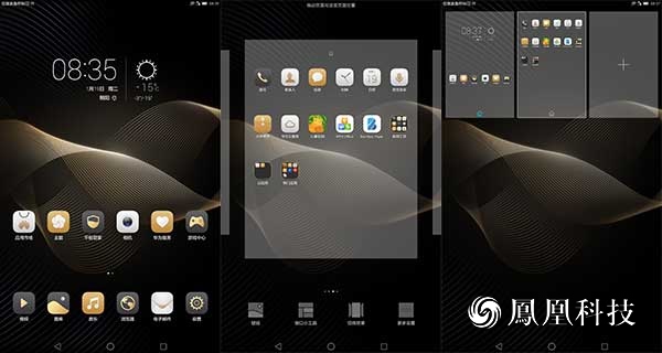华为揽阅M2 10.0采用了屏幕内置虚拟按键,我个人还是比较喜欢这样的设计的,因为在玩平板的时候,触控式的按键很容易就会导致误操作。回归正题,EMUI 3.1整个UI风格在华为揽阅M2 10.0上并没有什么变化,杂志锁屏这些功能也都保留了下来。在桌面上,我们可以看到华为揽阅M2 10.0支持手势操作功能,比如像是两指的聚合操作是编辑模式,多指的聚合操作则是进入页面管理。