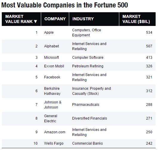 Facebook排名由一年前的第10位上升至第5位,目前市值为3210亿美元。
