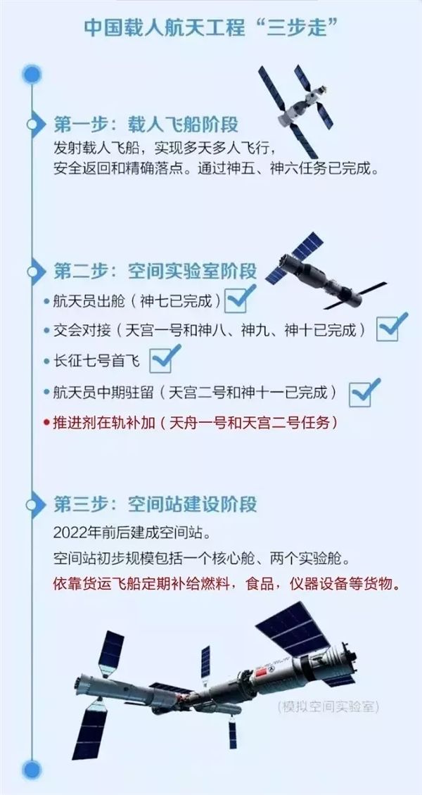 中国载人空间站计划2022年前后完成在轨组装并投入运营,开展较大规模的空间科学实验与技术试验。