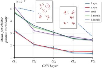 从图中可知,越深层提取到的特征越紧密,因此越深层提取到的特征越能反应出人脸关键点的位置。作者在采用 K=64 时,对所划分簇的样本进行平均后绘图如下: