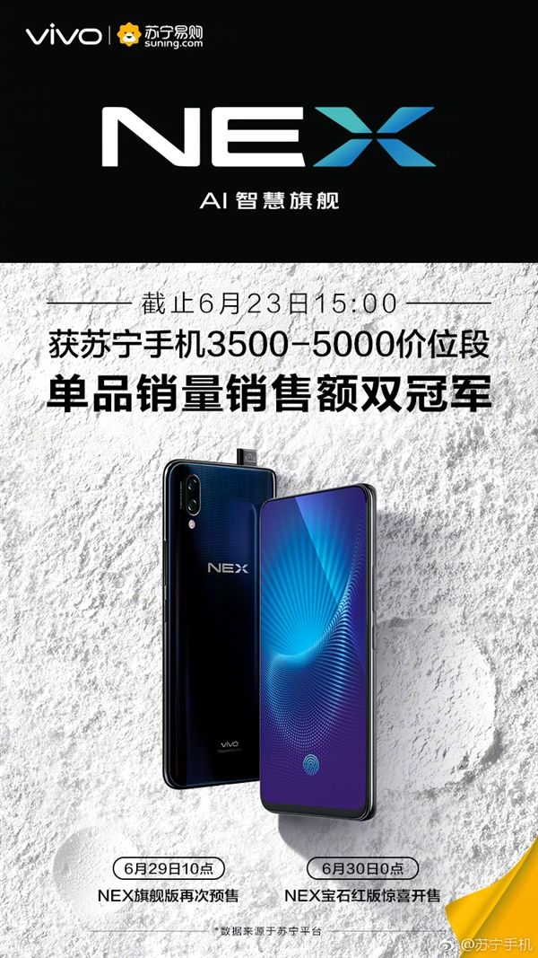 6月23日,苏宁手机官方微博公布了vivo NEX首销情况。截至6月23日15:00,vivo NEX斩获苏宁手机3500-5000元价位段单品销量&销售额双料冠军。