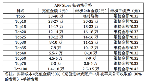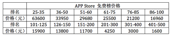 从凤凰科技拿到的一份机刷价格表可以看出,畅销榜、付费榜、免费榜价格不同,付费榜冲到top 10需要3.4万,免费榜冲进top 50就需要3.4万。