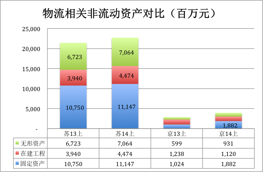 苏宁、京东对非流动资产的分类方式不完全相同。京东将房产、设备及软件归为一类,苏宁的固定资产主要为房产及设备(京东多了软件这项);苏宁的无形资产主要包括土地使用权及软件,2013年6月末京东无形资产约为2亿,与腾讯交易后升至76亿,应当与物流无关;京东将土地使用权单独列出,所以下表还是将京东的土地使用权列为无形资产。尽管两家分类上有交叉,但各家将各自的相关资产加起来不会出现重复计算。2014年6月末,苏宁固定资产、在建工程和无形资产合计226.8亿元,而京东对应资产仅为39.3亿。之所以拿出这三项非流动资产进行比较,因为物流建设投资形成的资产是它们的子集。