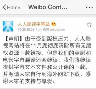 人人影视字幕站微博公告表示,“由于受到版权压力,人人影视网站将在11月底彻底清除所有无版权资源下载链接,但是我们的美剧和电影字幕翻译还会继续,我们将继续提供字幕文本文件和公开课的下载,片源请大家自行到海外网站下载,感谢大家的支持与厚爱。”此后该微博已经被删除。