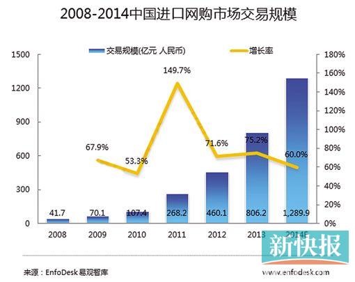 根据EnfoDesk易观智库监测数据显示,2010年至2013年,中国海外购物交易额从100多亿元增长到超过700亿元,2013年中国进口网购市场交易规模超过800亿元,增长率为75%。中国电子商务研究中心监测的数据显示,2013年中国内地“海淘族”规模已达到1800万。预测到2018年,中国的“海淘族”人数将达到3560万人,“海淘”规模将达到1万亿元人民币。据前瞻产业研究院预测,国内电商行业步入快速发展期,未来三年国内跨境电商规模增速有望达到28%。