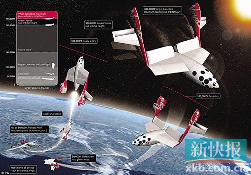 火箭助推装置点火推动其继续上升。当飞行速度达到音速3.3倍后,火箭发动机关闭,“太空船2号”在惯性作用下继续爬升至110公里高的亚轨道。 “太空船2号”由模样奇特的“白骑士2号”飞机在高空发射。“白骑士2号”挂载着“太空船2号”起飞,在达到约1.5万米的高空后,“太空船2号”脱离飞机, 从火箭发动机关闭到“太空船2号”再入大气层,乘客会经历为时约5分钟的失重状态,同时可以欣赏地球的景色。随后,“太空船2号”会以滑翔方式返回大气层。