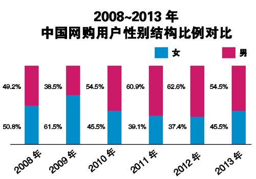 由于很多人错误认为,女人天生喜欢用购物来缓解压力,所以女性通常被认为是网购的主力军。然而,2008年至2013年的中国网络购物调查研究报告显示,“女人爱败家”与现实并不相符。网购用户中男性的比例高于女性,网购的人均金额也高于女性,买得比女性更加频繁的男性用户比例更高,表现出了强劲的购买力。