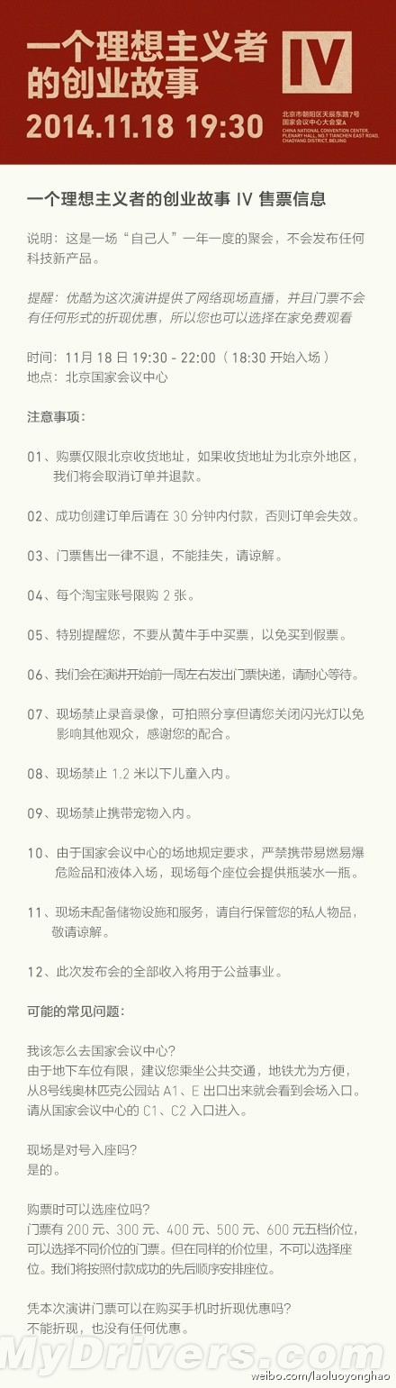 刚刚,罗永浩在微博宣布,今年的个人主题演讲会将在11月18日的北京国家会议中心举行,售票工作今天下午进行,售票范围仅限于位于北京的观众。