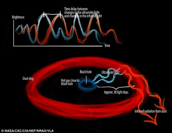 为了测量这一尘埃环结构的物理大小(即真实大小),研究人员测量了来自靠近黑洞边缘位置上的可见光以及环结构红外辐射之间的时间差。这一时间差代表的是从接近黑洞的环结构边缘出发的光(以光速)传播到环结构外缘(高温尘埃物质分布区)所花费的时间。