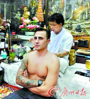 恒大新帅卡纳瓦罗日前到泰国造访了文身大师阿赞努。卡帅在后背处文了一道护身符,保佑事业腾飞。阿赞努是著名的文身大师,曾经为国际巨星安吉丽娜·朱莉文身。