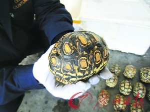 1月14日,经华南野生动物物种鉴定中心鉴定,该批活体动物为豹纹陆龟23只、黑凹甲陆龟6只、扁头长颈龟1002只、巨型蓝舌石龙子99条、老爷树蛙62只,均为宠物市场上热卖的观赏性宠物。![]()