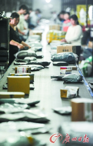 去年“双11”期间,位于南城的某快递公司内,流水线上的工人正在分拣快递件。广州日报记者葛宇飞 摄