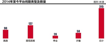 21世纪经济报道记者梳理网贷之家数据发现,2014年至今,共出现315家P2P问题平台,其中2015年以来的不足一个月里,即有40家出险。