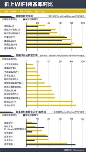 至于机型方面,与印象中的正相反,可上网的航班里程以及航班数量百分比,窄体客机都明显高于宽体客机,同时,波音系列在窄体和宽体两个领域分别领先空客。(编辑马红斌)![]()