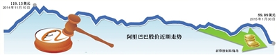 近期,2014年在美上市的阿里巴巴股价备受打击。阿里巴巴发行价为68美元,上市第一天开盘价高达92.7美元。2015年1月26日收盘价103.99美元,到1月30日时,收盘价为89.08美元,四个交易日总市值蒸发约367.53亿美元。