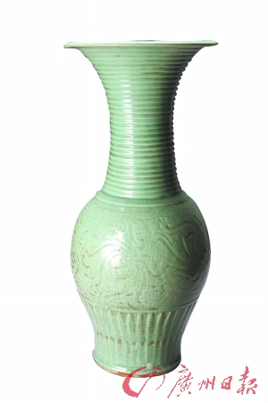 而元代龙泉窑造型最突出的特征还是它在烧造大件器上取得的技术突破,各种形体高大、气势雄伟的大瓶、大罐、大盘、大碗、大执壶等传世很多,如常见凤尾瓶中就有很多高达60或70厘米以上的大瓶,而口径宽达50或60厘米左右的敞口或菱花口的折沿大盘也十分多见。