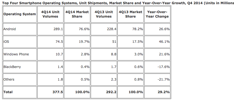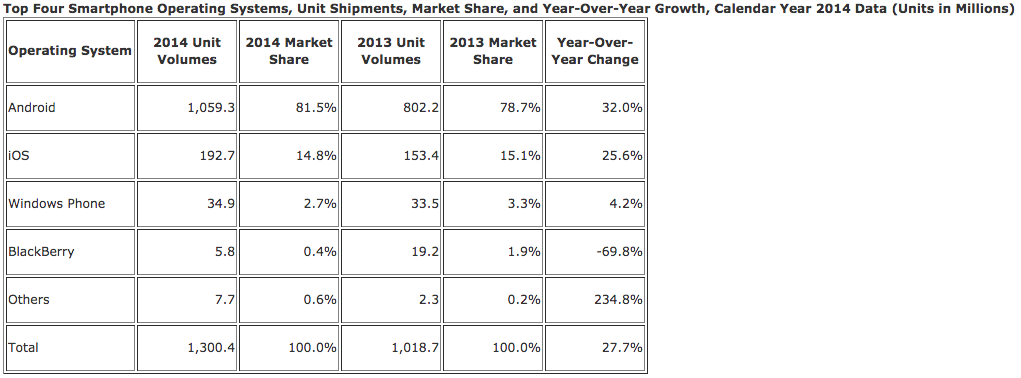 IDC:2014年Android全球智能机份额81.5% iOS占14.8%