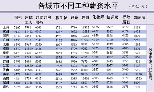 而在这些供不应求职位当中,建筑工人薪资最高,平均每月9621元;其次是导游,每月9415元。司机、订票订房服务和快递员分列第三、四、五位,平均薪资分别为8541元、5815元和5340元。报告显示,从不同城市的薪资水平上看,上海薪资最高,平均每月5825元;一线城市中,深圳、广州和北京分列第二、三、四位,平均薪资分别为5489元、5448元和5419元。均超过各城市每月平均薪资4957元。