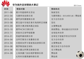 之后,从2013年下半年开始,华为终端连续赞助了德甲多特蒙德、意甲AC米兰、西甲联赛、英超阿森纳、法甲巴黎圣日耳曼等诸多传统欧洲强队。东欧和中东地区同样处于华为品牌营销的覆盖之内。2013年8月,华为冠名了第五届中东地区青年海湾杯足球赛,2014年6月又成为俄罗斯足协官方合作伙伴。