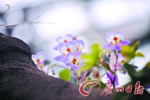 紫色的花瓣、黄色的花蕊,一朵朵、一簇簇长在岩石上,在华南植物园奇异植物温室,记者见到了刚刚发表的“封开报春苣苔”。