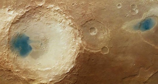 据英国《每日邮报》6月1日报道,欧洲宇航局“火星快车”号探测器拍摄到火星表面疑似出现神秘蓝色泻湖。然而欧洲宇航局表示,这些在火星陨石坑中发现的“蓝湖”实