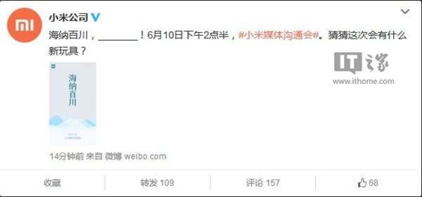 IT之家讯小米刚刚在官方微博上表示,将于6月10日下午2点半举行小米媒体沟通会,并附上了一张海报,海报中间写有“海纳百川”四个大字,有网友猜测小米将发布智能净水机产品,这个还是有很大的可能性的。