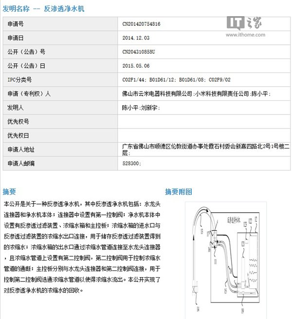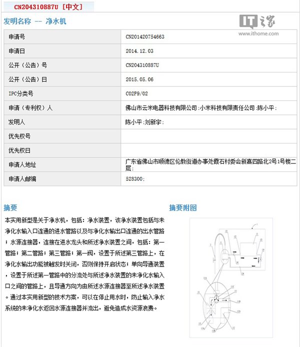 实际上,早在去年12月份,小米就申请了有关净水机的专利,申请人是佛山市云米电器科技有限公司和小米科技有限公司,发明人是陈小平和刘新宇。因此,小米发布净水机产品的可能性非常大。