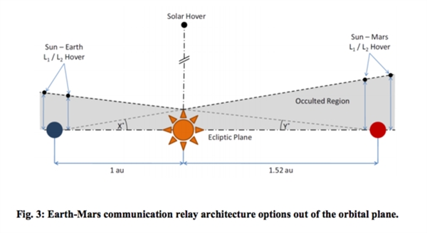 不过,在没有太阳遮挡的时候(火星地球在太阳同一侧的时候),是不需要这两颗中继卫星的,直接通信是最省的方案。只有在有太阳遮挡的时候才启用上述两颗Non-Keplerian中继卫星。