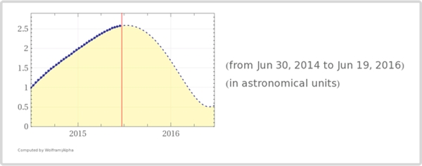 下面是从2014年6月30日到2016年6月19日之间,地球和火星之间的距离变化,横轴是时间,纵轴是距离,单位是AU,而光前进一个AU所需要的时间大约是8分钟。