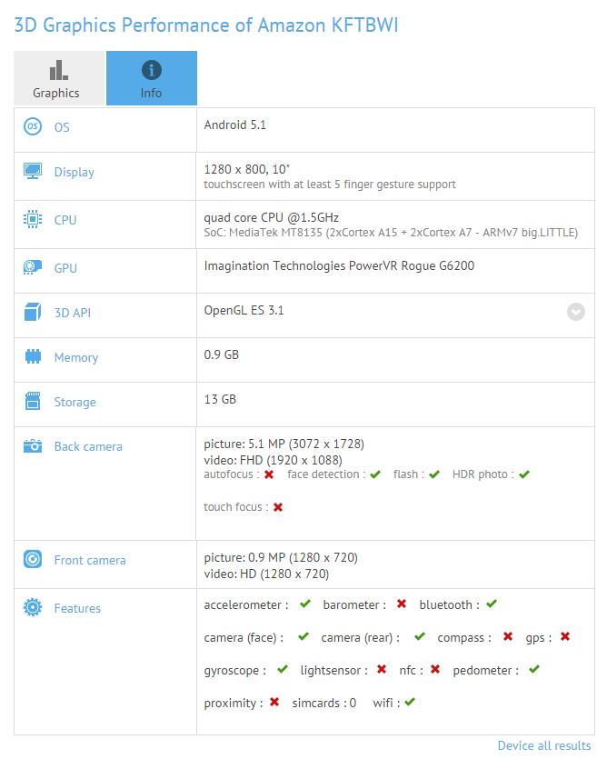 凤凰科技讯 北京时间9月17日消息,科技网站Phonearena今日刊文称,今早在网上出现了一张10英寸Kindle Fire的渲染图,从渲染图来看,该机外观上变化不大,但其运行的可能是重新设计的Fire OS版本——基于的Android系统深度定制。渲染图曝光不久,就在GFX Bench跑分网站上出现了一款10英寸的Kindle Fire,其参数也被完全曝光。如果参数准确的话,那就意味着该平板将主打中低端市场。