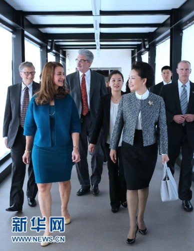 彭丽媛抵达时,受到研究中心主任吉利兰、盖茨基金会联席主席比尔-盖茨夫妇、美国驻华大使博卡斯夫人韩斯的热情欢迎。