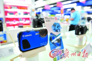 苏宁祖庙店去年将数码区迁至二楼,今年又迁回一楼,但面积明显比一年多以前离开这里的时候小了很多。面积减少的部分主要是卡片机陈列区,款式品种比过去减少了很多。而且摆在显眼位置的多数是单反或微单。而一台看似卡片机的相机被陈列在台面显眼位置,反倒让人觉得好生奇怪。“其实这不是一台普通的卡片机,这是一台运动型的相机。”促销员阿毅拿起这台“卡片机”翻开上面的屏幕,把他竖立起来,然后夹到自己的背包上让记者看,这台相机可以夹在背包、衣服上,也可以夹在行驶的单车、赛车把手上面,边运动边拍摄运动画面。