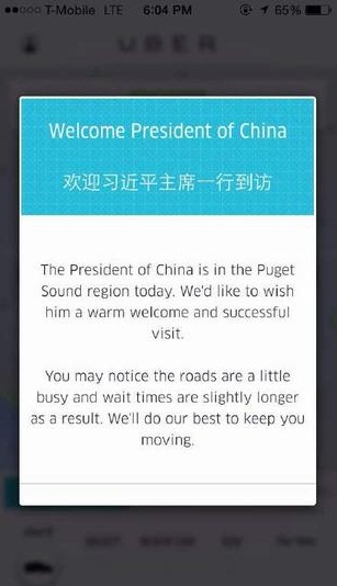 在习大大到达前几个小时,西雅图的Uber用户打开应用后会自动跳出“欢迎习近平主席一行到访”中英文信息,并提示用户由于交通繁忙,可能需要多些等待时间。