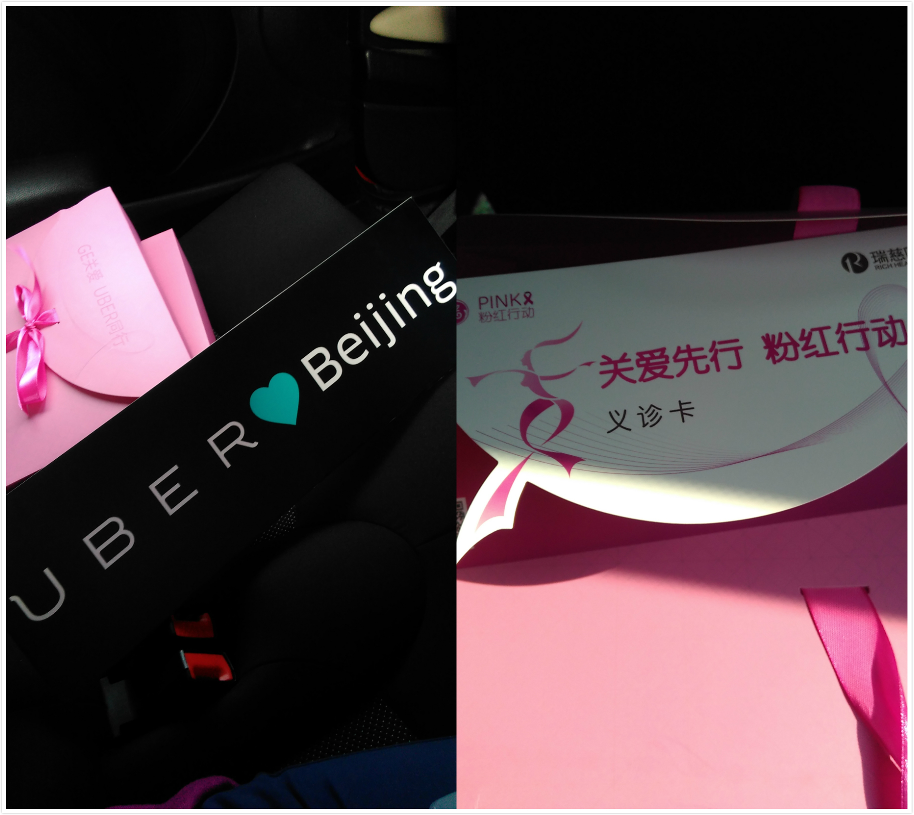 北京的用户在活动时间内打开Uber会收到推送通知,在优惠中输入“GEUBER”,就可以参加一键呼叫PINK的活动,当周围有粉色小车时,用户可以收到Uber司机和员工一起送来的一份礼包,内含两份免费的女性健康体检卡。Uber员工介绍称,这次活动在北京闹市区域均有,预计送出200份。