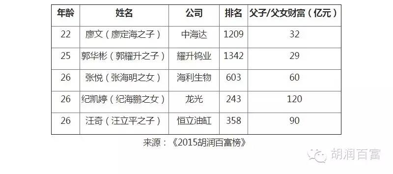 有2位继承财富的“90后”上榜,广州中海达廖定海之子廖文为最年轻的上榜少壮派,仅22岁;其次是耀升钨业郭耀升之子25岁的郭华彬。