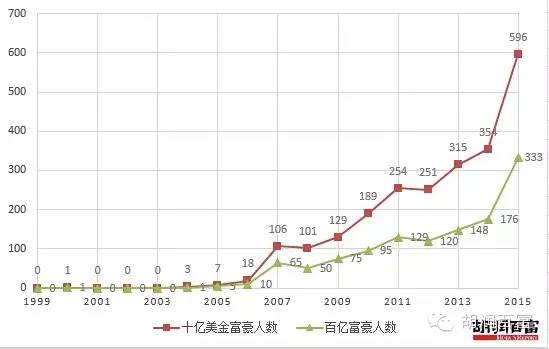 上榜百亿富豪人数从去年的176位增加到333位,十年前只有5位,如果加上隐形富豪,大陆应该有700位百亿富豪。十亿美金富豪人数从去年的354位增加到596位,中国第一次超越美国。如果加上港澳台的119位,大中华地区现在有715位十亿美金富豪,相比美国的537位,超过美国178人之多(大中华区和美国数字来自2015胡润全球富豪榜)。如果加上隐形富豪,大陆应该有1500位十亿美金富豪。而千亿富豪人数从去年的6位减少到4位。