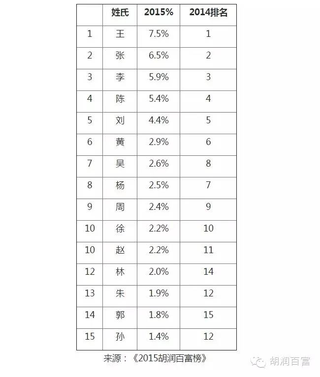 《2015胡润百富榜》中,姓王的企业家仍然最多,比例也比去年上涨了7%。刘和林也表现不错。而人口数量最多的李却表现一般,只排在第三位。