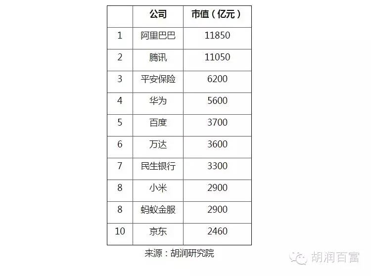 市值最大的公司:今年有2家公司市值超过1万亿:阿里巴巴和腾讯。五年前,阿里巴巴市值只有1300亿,腾讯市值2300多亿。
