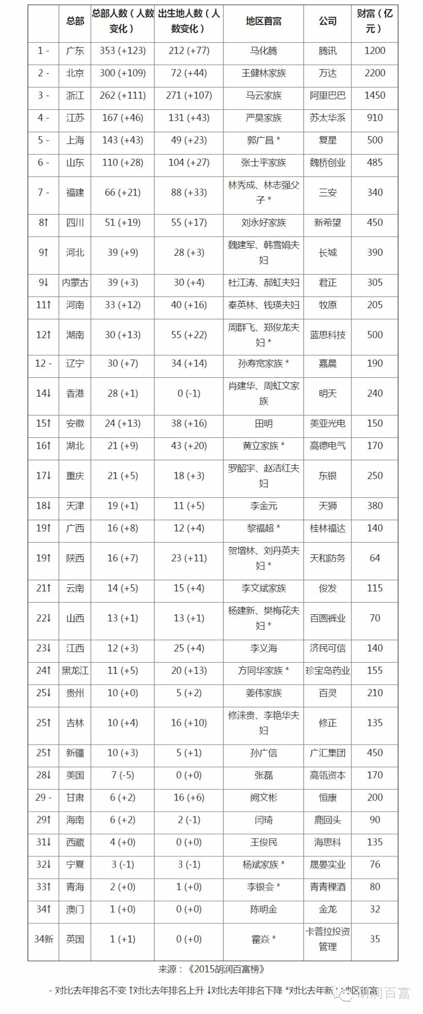 广东仍然是最多上榜企业家设立企业总部的地区,有353位,又比去年增加123位;北京仍为第二,有300位,比去年增加109位;浙江位居第三,有262位,比去年增加111位;四川、河北有所上升。对比去年,有12位新的地区首富。只有36位上榜企业家将企业总部设在大陆以外,其中,香港最多,有28位;美国第二,有7位;英国第三,有1位。