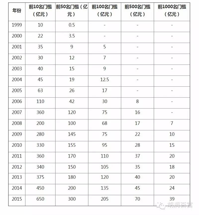 上榜门槛连续三年保持20亿元,今年有1877位企业家上榜,比去年又增加606人,上榜人数达历年之最。前10名的上榜门槛比去年提高44%,达到650亿。前1000名的上榜门槛从去年的24亿提高到39亿。