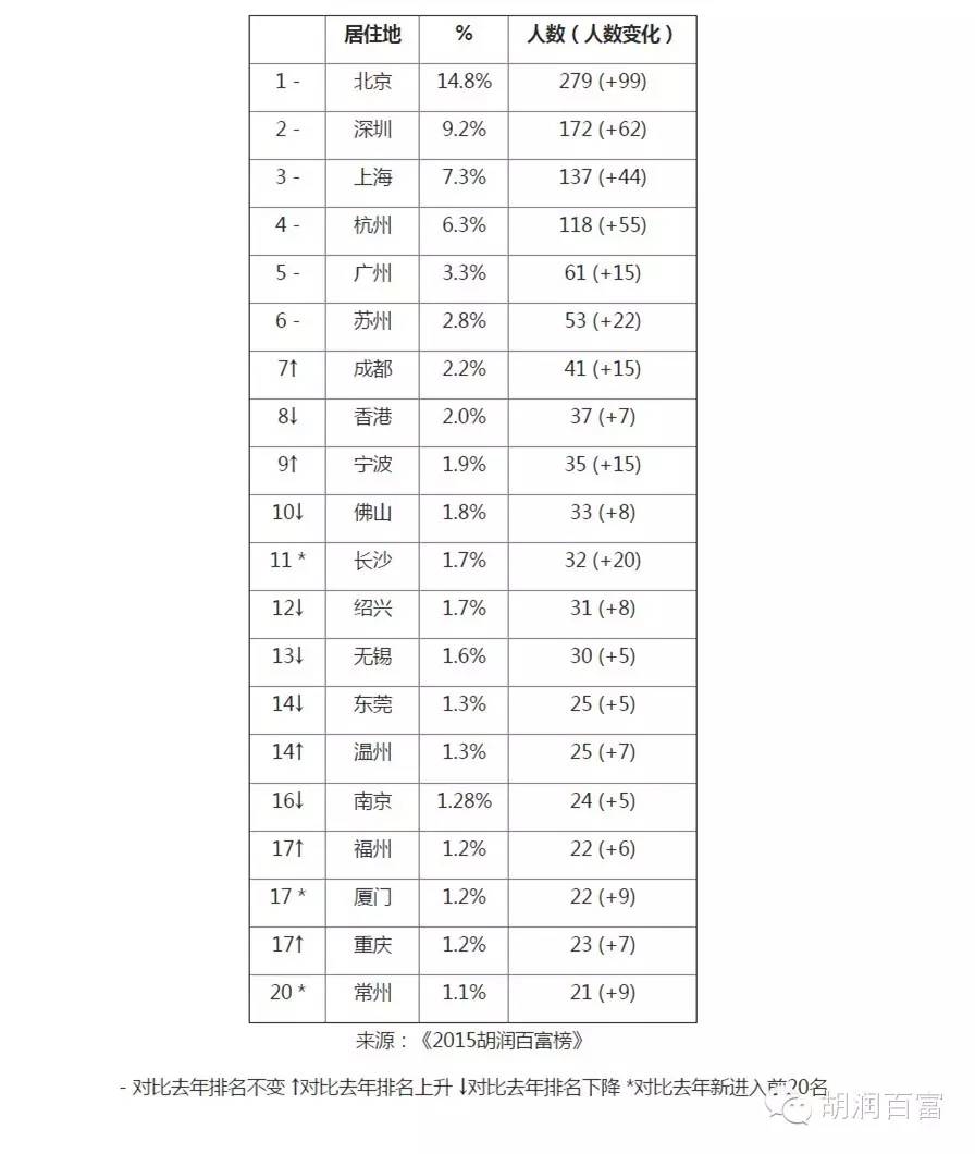 10.北京仍然是最多企业家偏好居住的城市,279位上榜企业家居住在北京,比去年增加99位;深圳保持第二,172位,比去年增加62位。北京和深圳连续两年拉大与第三名上海的距离。上海137位,比去年增加44位。人数涨幅最大的是长沙,增加20人,达到32人。杭州、宁波、常州、苏州、厦门和成都的涨幅也都在50%以上。