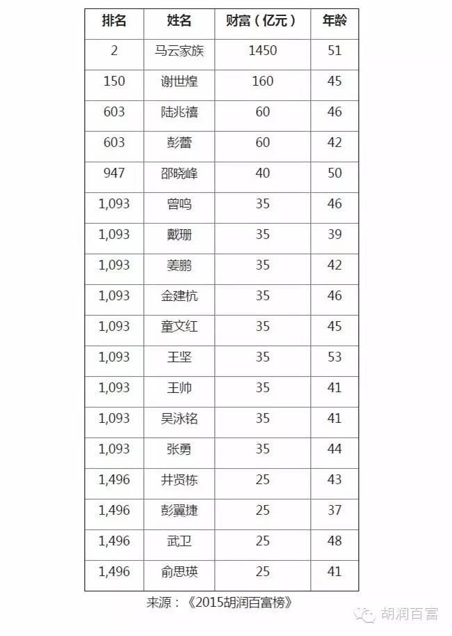 51岁的马云及其家族以1450亿元退居第二,财富比去年减少3%,主要因为上市公司表现差强人意,阿里股价由上市首日的93美金跌了20%。但马云的另一块主要资产——支付宝母公司蚂蚁金服却表现抢眼。今年7月,蚂蚁金服完成A轮融资,市场估值高达450亿美金。社保基金、国开金融以及数家保险大鳄都战略入股蚂蚁金服。马云财富主要分为三部分:阿里巴巴6%的股份、蚂蚁金服及其个人投资。最近一年,马云投资了数个项目,包括36亿投资魅族,24亿入股光线传媒,12亿入股第一财经。今年5月,阿里又宣布已联手马云创立的云锋基金战略投资圆通速递。胡润表示:“马云是目前最具活力的上榜企业家”。今年阿里巴巴有包括马云和谢世煌在内18位高管上榜。