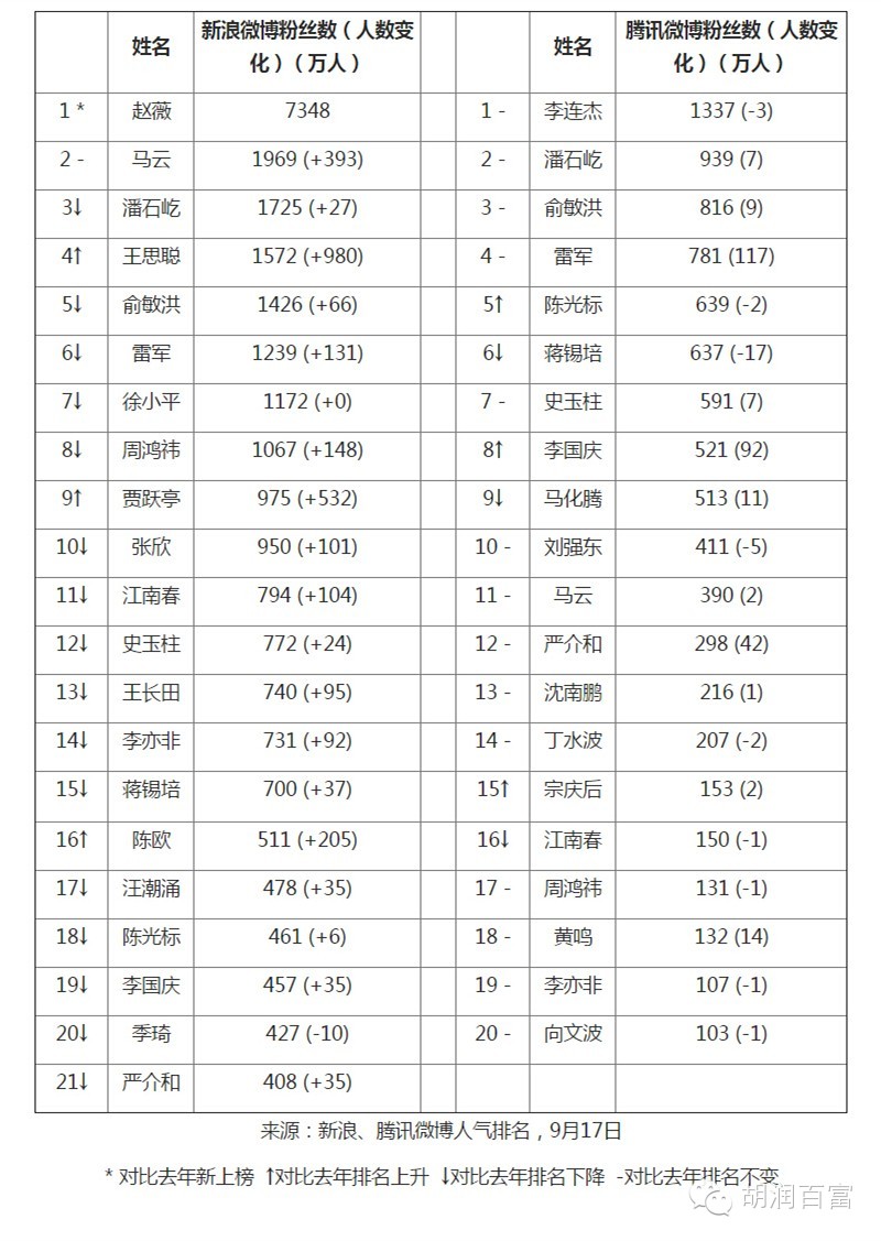 15.3位文体明星上榜:演员赵薇以财富40亿位列第947、李连杰以财富25亿位列第1496、运动员姚明以财富21亿位列第1690。赵薇今年也代替潘石屹成为微博最红的企业家。