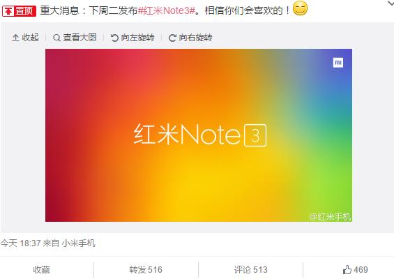 凤凰科技讯 11月22日消息,小米新品发布会将在下周二,也就是11月24日在北京举行,这次小米通过微博频繁自曝,今天红米手机发微博,称下周二将发布红米Note 3,一举否定了外界谣传的Note 2 P
