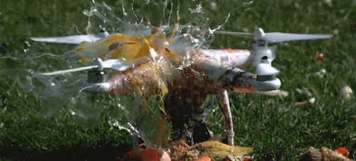 至于具体的杀伤力能到哪一种程度?上面这张GIF图或许可以说明一切。在图中我们可以清楚的看到,落下的鸡蛋在掉落到相关位置时,被旋转的螺旋桨瞬间打出了成吨的伤害,真的可以说是瞬间爆炸了。并且, 这个无人机的螺旋桨还并没有处于旋转的最佳状态。
