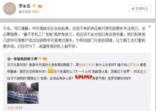 截图引发网友围观,不少人称赞锤子科技是有责任感的公司,罗永浩是有责任感的企业家,但也有网友表示,作为小厂商,中天信倒闭或许对华为中兴影响不大,但对锤子科技而言,则关乎生存和命运,锤子科技只是在自救,没必要觉得太感人。