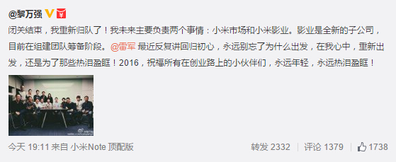其微博称,“闭关结束,我重新归队了!我未来主要负责两个事情:小米市场和小米影业。影业是全新的子公司,目前在组建团队筹备阶段。最近反复讲回归初心,永远别忘了为什么出发,在我心中,重新出发,还是为了那些热泪盈眶!2016,祝福所有在创业路上的小伙伴们,永远年轻,永远热泪盈眶!”