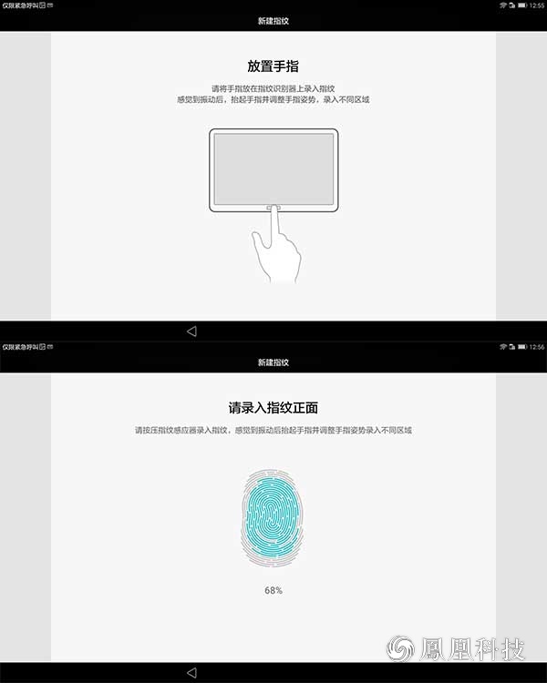 在指纹体验方面,华为揽阅M2 10.0把指纹传感器做成了类似Home 键的设计,它并不能通过按压实现Home 键功能,但是长按的效果是相同的,并且还能通过左滑实现返回,右滑则是多任务界面,可以替代虚拟按键。在设置好密码之后,我们可以在设置菜单中看到“指纹”的选项,点开之后就可进行录入,可能是为了照顾平板更多的持握方式,录入的次数比较多,录入的比较精细。