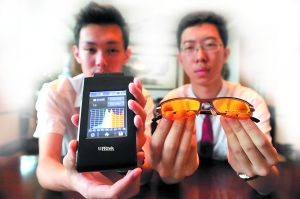 那么,什么材料可以阻挡蓝光对眼睛的损害?高琨翔说,原理其实很简单,红、绿、蓝是自然界中的三原色,红色加绿色是黄色,黄色是蓝色的补色,蓝色无法透过黄色,因此可以通过黄色来过滤蓝光。他们从化学用品店找到一种液体物质,勾兑在制作镜片的树脂中,得到黄色材料,既能起到阻挡蓝光的作用,又不影响视觉效果。这种液体物质到底是什么? “这个要暂时保密,因为我们正在申请专利。”“小发明家”神秘地表示。